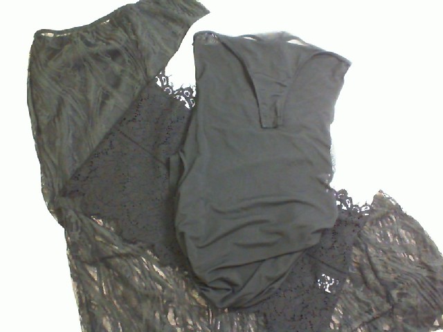 Women's 3-piece suit. Sheer lace skirt, white top with black lace, sheer bodysuit