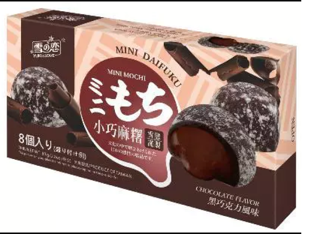 Enjoy the delightful taste of Mochi Mini Chocolate, featuring a soft and chewy exterior that encases a rich, luscious chocolate filling. Each piece is individually wrapped, making it perfect for sharing or indulging on your own. The product's Japanese origins are evident in its elegant packaging, adorned with traditional motifs and sophisticated colors that appeal to both the eyes and the palate. With a net weight of 80g, this box contains 8 delicious mini mochi, making it an ideal treat for any chocolate lover.
