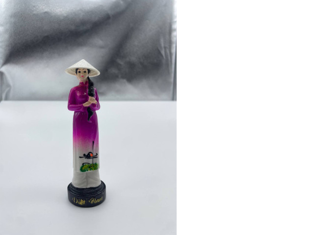 This charming souvenir figure depicts a woman in traditional Vietnamese attire, known as an 'ao dai'. The figure wears a vibrant purple dress that elegantly transitions into white, showcasing a beautiful gradient. Her delicate straw hat adds authenticity and cultural significance, highlighting the beauty of Vietnamese tradition. With a serene expression and a graceful posture, she holds a small item, possibly symbolizing care or dedication. This figure makes a perfect decorative piece, capturing the essence of Vietnamese heritage.