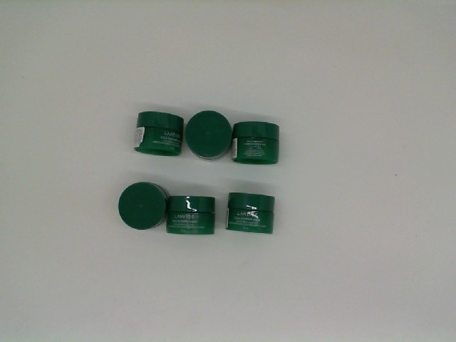 This is a pack of six LANEIGE cica sleeping masks, each containing 10 ml of the product. The masks are designed to help soothe and renew the skin overnight. Each jar is a lush green, reflecting the natural ingredients and calming essence of the mask. The compact size of the jars makes it convenient for trial use, travel, or as thoughtful gifts. The cica extract is known for its healing properties, which can help with redness and strengthening the skin barrier. The set is appealing for those looking to indulge in a Korean skincare routine focused on hydration and repair.