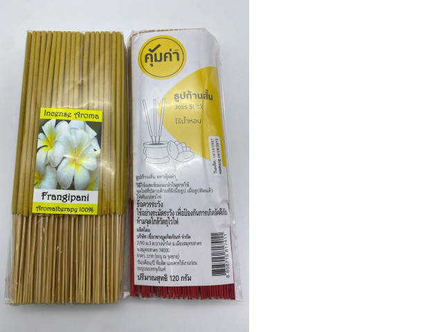 This set includes two types of short incense sticks, each offering a unique aromatic experience. The yellow sticks, labeled 'Frangipani', are made from 100% natural materials and are designed for aromatherapy, promoting relaxation and a calming atmosphere. The vibrant color and delicate design of these sticks enhance their visual appeal. The other pack features red sticks, labeled 'Joss Stick', which may add a touch of traditional elegance to your space. These incense sticks are ideal for creating a serene environment during meditation or yoga sessions, enriching your sensory journey.
