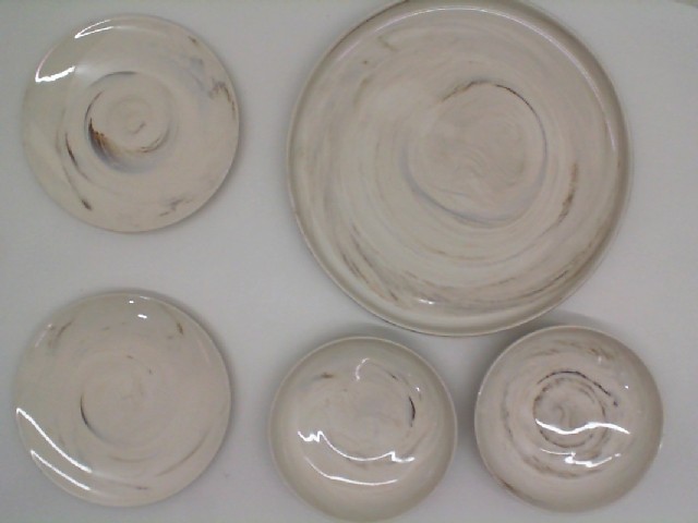 Set of 5 beige plates, includes 2 flat, 2 deep and one large plate
