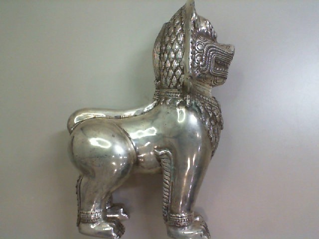 This enchanting statue is a handcrafted depiction of a lion, carved with skill from stone, likely to..