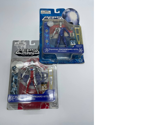 This set includes two collectible PEPSI figures, each designed with distinct features that celebrate the iconic PEPSI brand. One figure, known as Pepsiman, showcases a silver and red suit with the PEPSI logo emblazoned on the chest, embodying the spirit of fun and adventure. The second figure is also styled similarly but features a blue color scheme that adds variety to the collection. Both figures come with accessories that enhance the play experience, including miniature snowboards. Ideal for collectors and fans alike, these figures are perfect for display and encapsulate the vibrant culture around PEPSI.