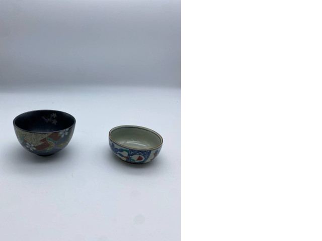 This beautiful set of two small square blue Japanese dipping sauce cups features intricate and elega..