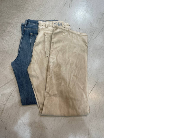 This unique set of 2 secondhand painted jeans features a creative mix of colors and patterns, showca..