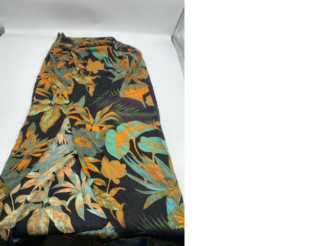 This women's long skirt features a vibrant floral pattern with a rich color palette of greens, oranges, and soft blues against a classic black backdrop. The intricate design showcases an array of bold tropical leaves and flowers, adding a refreshing and lively touch to your wardrobe. The lightweight fabric drapes beautifully, making it perfect for warm weather outings or beach vacations. Its versatile style allows it to be dressed up for an evening event or paired casually for daytime wear, ensuring you always stand out in effortless elegance.