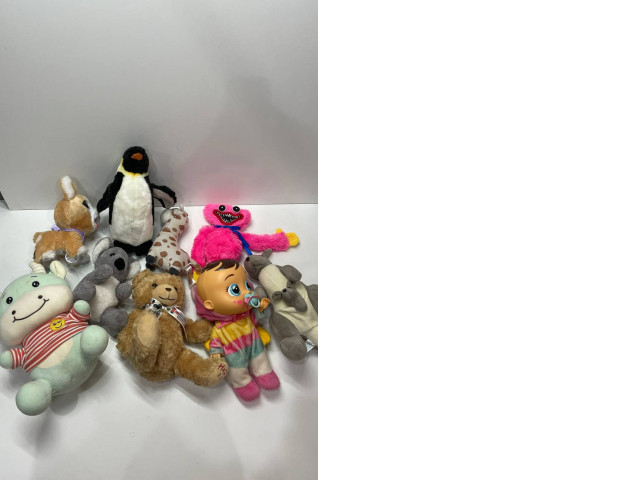 This delightful set of soft toys features a charming assortment of plush animals and dolls. Included are a cuddly teddy bear with a sweet expression, an adorable baby doll dressed in colorful attire, and a variety of animal plushies, such as a penguin, a koala, and a playful pink creature. Each toy is made from high-quality, soft materials, ensuring they are perfect for hugging and cuddling. The varying sizes and vibrant colors of these toys make them visually appealing and perfect for imaginative play. This set encourages creativity, storytelling, and emotional bonding, making it an ideal gift for children.