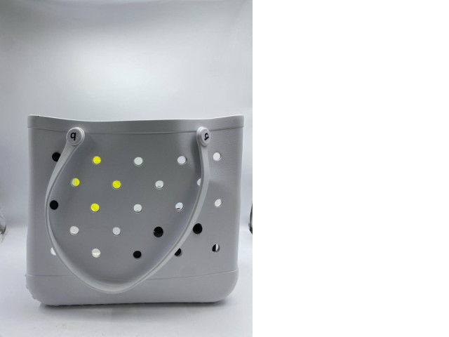 This grey beach bag is perfect for sunny days by the shore. Made from durable materials, it features a unique design with colorful ventilation holes that not only add a stylish touch but also ensure airflow, keeping your belongings fresh. The spacious interior allows for easy storage of all your beach essentials, while the sturdy handles offer comfortable carrying. Its lightweight structure makes it an easy companion for any beach outing.