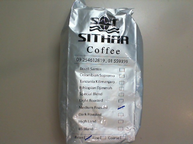 Sithar coffee beans from Myanmar offer a unique taste profile that delights coffee enthusiasts. The packaging indicates that the beans are medium roasted, which suggests a balanced flavor that is neither too strong nor too light. The shiny silver packaging is visually appealing and adds a touch of modernity, making it stand out on the shelf. The blend includes selections from various origins, hinting at a complex and rich flavor experience. Enjoy a cup of Sithar coffee to savor the essence of Myanmar.
