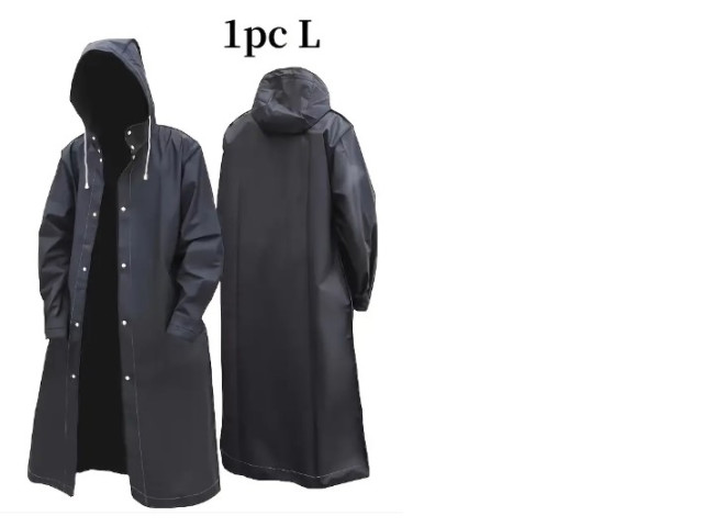 This black raincoat combines practicality and style, making it an essential addition to your wardrobe. The long design offers full coverage, protecting you from the elements, while the sleek, waterproof material ensures you stay dry. Features include a spacious hood and a front closure with snap buttons for easy wear. The minimalist aesthetic is enhanced by the contrasting white stitching, adding a touch of modern flair. Perfect for rainy days, this versatile piece is ideal for both casual outings and outdoor activities.