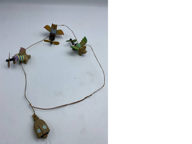 This charming set of handmade bells features whimsical designs, including colorful wooden characters..