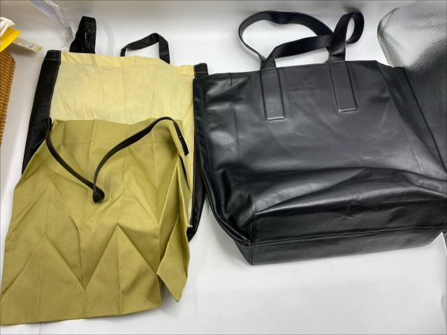 This set of shopping bags is designed for practicality and style. Featuring a sleek black leather bag that offers durability and a sophisticated appearance, it makes a perfect choice for everyday use. Additionally, included in the set is a stylish olive-green bag with a unique pleated design, providing a touch of elegance while remaining functional. Both bags come with sturdy handles, making them easy to carry, whether for groceries or other shopping needs. This versatile set combines aesthetics and utility, ensuring you look good while being environmentally conscious.