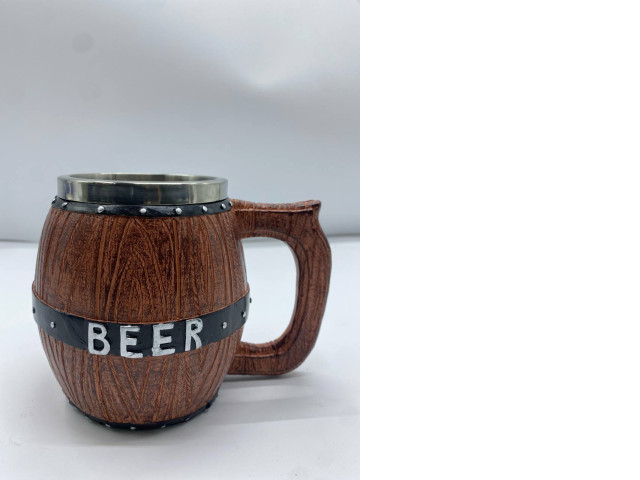 The Souvenir Beer Cup features a unique barrel design that captures the essence of traditional beer brewing. Made from high-quality materials, its textured wooden appearance enhances its rustic charm. The metal band around the cup, embossed with the word 'BEER', adds a stylish touch, while the durable handle provides a secure grip. This cup is perfect for enjoying your favorite brews or as a decorative piece in your home.