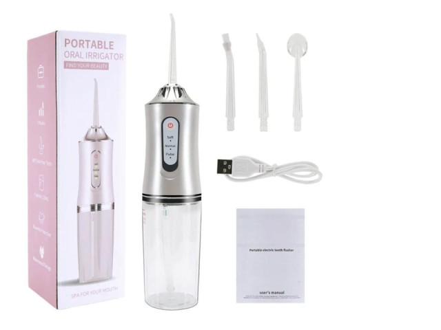 The Portable Dental Oral Irrigator is designed for effective oral hygiene at home and on the go. With a generous 220ml capacity, it provides ample water for thorough cleaning. Featuring three adjustable modes - Soft, Normal, and Pulse - this irrigator caters to all your dental needs, allowing for a customized experience. Its sleek, ergonomic design, highlighted by a stylish silver and pink finish, not only looks great but also ensures a comfortable grip during use. Included are multiple tips for targeted cleaning, making it ideal for various oral care needs. The USB charging capability adds convenience, making it a perfect travel companion. Enjoy a spa-quality dental routine wherever you are!