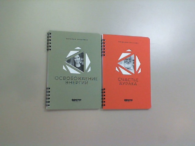 The product appears to be a set of two notebooks, each with an evocative title that suggests personal development themes. The vibrant orange notebook is titled 'Счастье дурака' which translates to 'The Happiness of the Fool’ in English, while the serene green notebook is titled 'Освобождение энергии', 'The Release of Energy'. Both notebooks have a modern and clean design, featuring geometric shapes and a cut-out window that reveals a part of a person's face, adding a unique artistic touch. The contrast between the bright orange and calm green could be seen as representing different emotional states or aspects of personal growth. These notebooks would be particularly appealing to those interested in self-reflection, journaling, or self-help topics, offering a space to write down thoughts, experiences, and energy-releasing exercises.