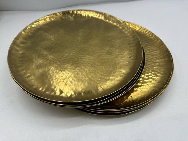 This elegant set of 5 brass pans features a stunning hammered design that adds a touch of sophistica..