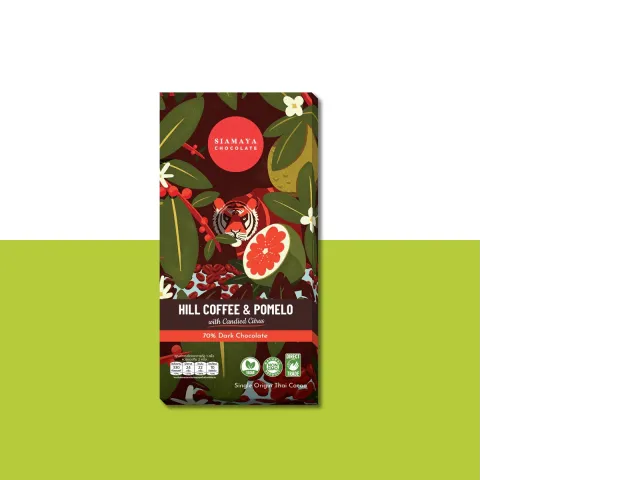 Indulge in the unique flavor profile of 'Hill Coffee and Pomelo Dark Chocolate.' This exquisite set features two bars of 70% dark chocolate, expertly crafted with the rich essence of hill coffee and the refreshing zing of pomelo. The eye-catching packaging highlights lush green leaves and vibrant pomelo slices, bringing a touch of nature's beauty to your chocolate experience. Perfect for connoisseurs and casual snackers alike, this chocolate promises a delightful combination of bitterness from the dark chocolate and sweet citrus notes from the candied citrus, making each bite a harmonious adventure.