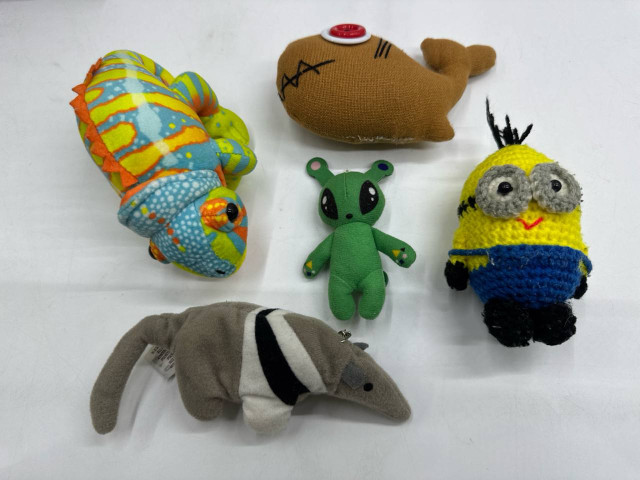 This delightful set features five colorful and charming plush toys, each designed to capture the imagination of both children and collectors alike. The assortment includes a vibrant chameleon, its body adorned with a stunning mix of blue, green, and orange hues, showcasing a playful pattern that mimics the unique appearance of real chameleons. Next is an adorable green alien figure, complete with big eyes and a friendly demeanor, inviting playful interactions. The set also includes a bright yellow and blue minion character, crafted with a round body, cheerful expression, and signature goggle details, making it instantly recognizable and loved by fans. Additionally, a whimsical brown whale plush adds a cute aquatic touch, with playful embroideries that emphasize its jovial nature. Lastly, there’s a soft, gray aardvark toy with distinctive black stripes, exuding a gentle, huggable quality. Each toy is made from high-quality, soft materials, ensuring safety and comfort for children while providing an enjoyable tactile experience.