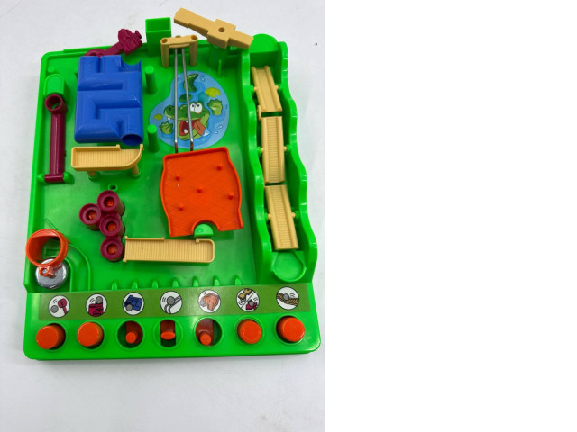The TAKARA TOMY Athletic Land Game is a vibrant and engaging playset that combines fun and skill in a variety of sports-themed activities. The game features a bright green base, adorned with colorful components including a blue maze-like structure, orange and red items representing various sports equipment, and a playful illustration of a crocodile character that adds a whimsical touch. Players can navigate through the intricately designed layout by using buttons that activate different mechanisms, such as ramps and slides, creating an exciting interactive experience. The game promotes coordination, timing, and strategic thinking as players aim to achieve objectives and complete challenges within the bright and playful environment.