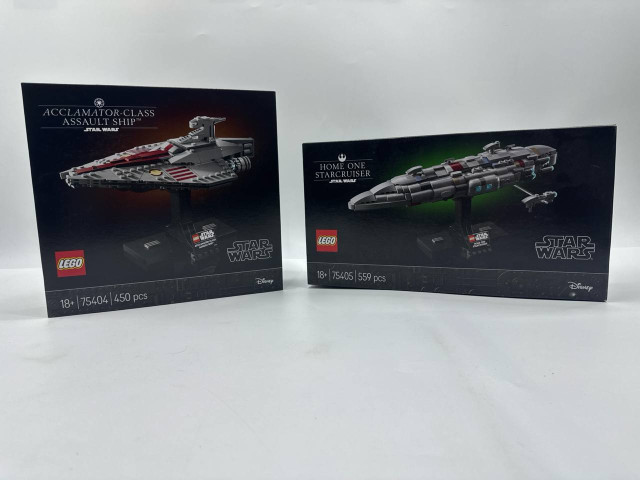 This set features two used LEGO Star Wars ships: the Acclamator-Class Assault Ship and the Home One Starcruiser. The Acclamator-Class Assault Ship is intricately designed, showcasing its unique red and gray color scheme and prominent detailing that reflects its battle-ready aesthetic. It comes with 450 pieces, targeting adult collectors with its 18+ age recommendation. The Home One Starcruiser is a sleek and elongated battle cruiser with a dark gray finish and a mix of colors that hint at its advanced technology. With a higher piece count of 559, it represents another stunning addition to any Star Wars collection. Both models include stands for display, allowing fans to showcase these iconic ships from the beloved franchise. Designed for durability and playability, they are perfect for building enthusiasts and Star Wars aficionados alike.