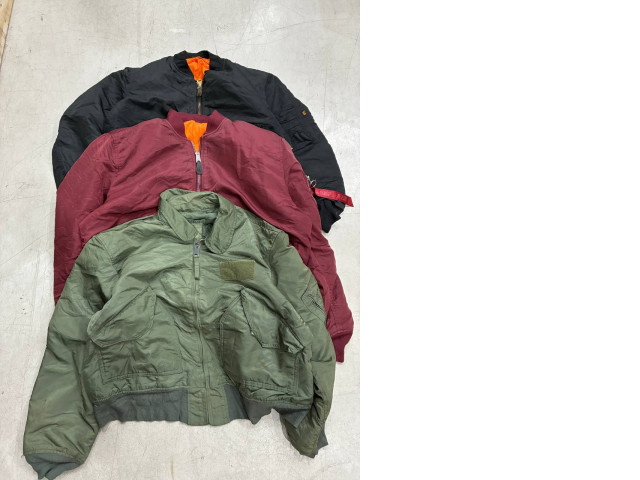This set includes two SECONDHAND bomber jackets, each with a distinct design and a vibrant orange li..
