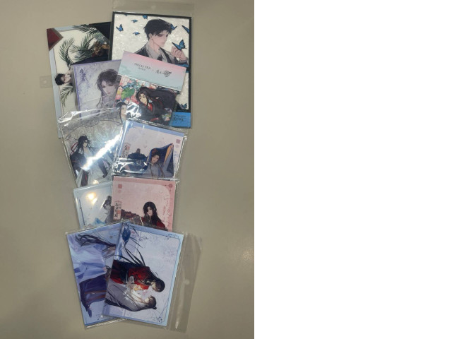Set of acrylic figures of cartoon characters, acrylic photo card, two keychains