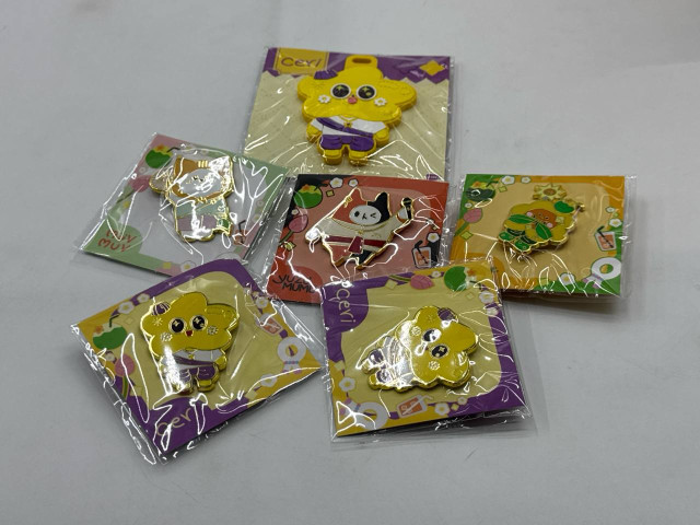 This set features six vibrant brooches, each adorned with playful and whimsical designs. The brooches are crafted from high-quality materials, exhibiting a glossy finish that catches the eye. The characters showcased include a cheerful yellow star with big, expressive eyes, a panda-like figure, and other fun characters presented on colorful backing cards. Each brooch is unique, offering a delightful mix of colors such as yellow, green, and red, enhancing their charm. Perfect for accessorizing bags, jackets, or hats, these brooches are a fun addition for anyone looking to add a playful touch to their outfit.