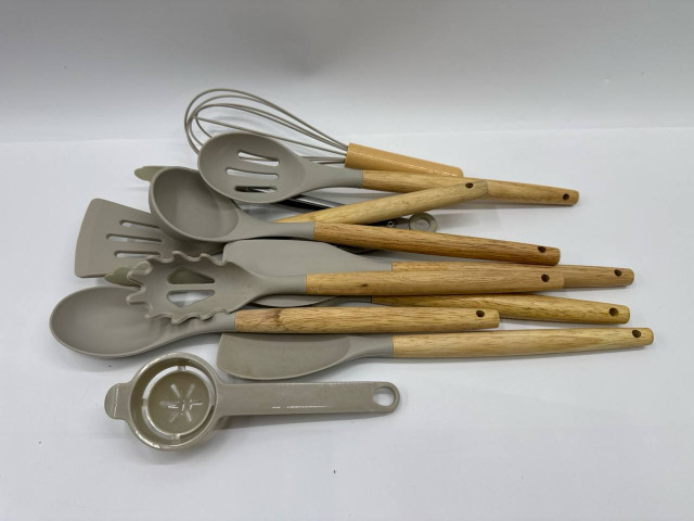 This versatile set of kitchenware cooking utensils is perfect for all your cooking and baking needs. The collection includes a variety of essential tools such as a spatula, slotted spoon, whisk, and measuring spoons. Each utensil is designed with an ergonomic wooden handle, providing a comfortable grip while cooking. The utensils are crafted from durable, food-grade silicone, making them heat-resistant and safe for use with non-stick cookware. The sleek, modern design features a neutral beige color that complements any kitchen décor. Ideal for both novice cooks and seasoned chefs, this set is a must-have for preparing and presenting your favorite dishes.