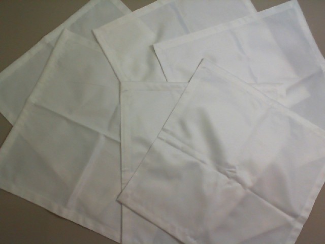 This elegant set of 6 satin napkins is ideal for upscale table settings, offering a touch of sophistication and class. In the image, the napkins display a pristine white color, suggesting a clean and refined dining experience. The visible neatly folded edges accentuate their meticulous craftsmanship, and the smooth, shining surface of the satin fabric adds a luxurious feel to the table decor. These napkins are not only aesthetically pleasing but also functional, protecting the table surface and serving as a beautiful accompaniment to tableware and centerpieces.