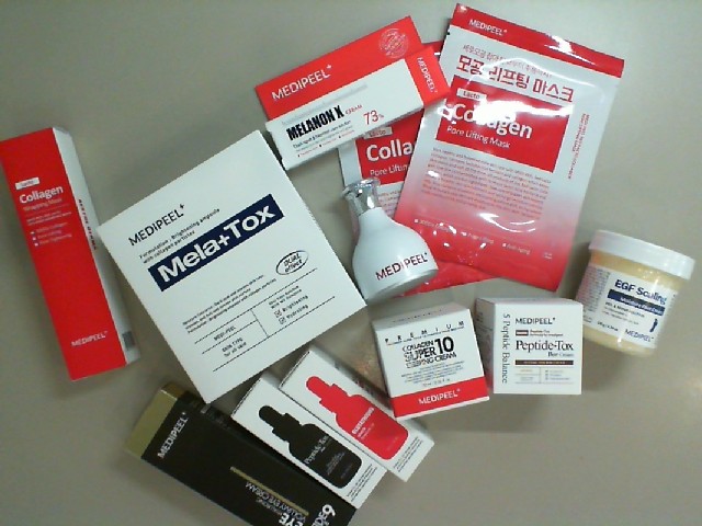 Medipeel+ Cosmetic Set foot cream, 2 face masks, collagen night cream, peptide-tox cream, eye cream, 2 facial serums (night and day), skin care complex, collagen wrapping mask, Melanon X cream