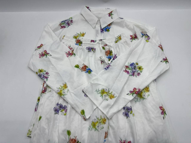 Set of 2 White long-sleeved shirt with floral pattern and white long pants with floral pattern