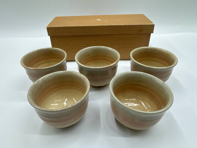 Set of 5 Glass, light brown hot tea glass in a wooden box