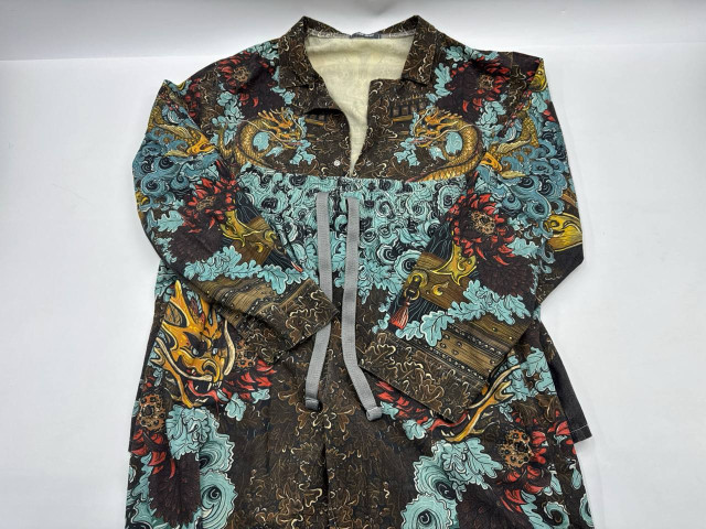 Set of 2 Women's green long-sleeved button-down shirt with dragon pattern and women's green long pants with dragon pattern