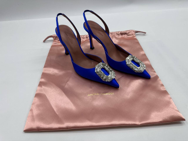 Women's blue high heels with beaded decorations