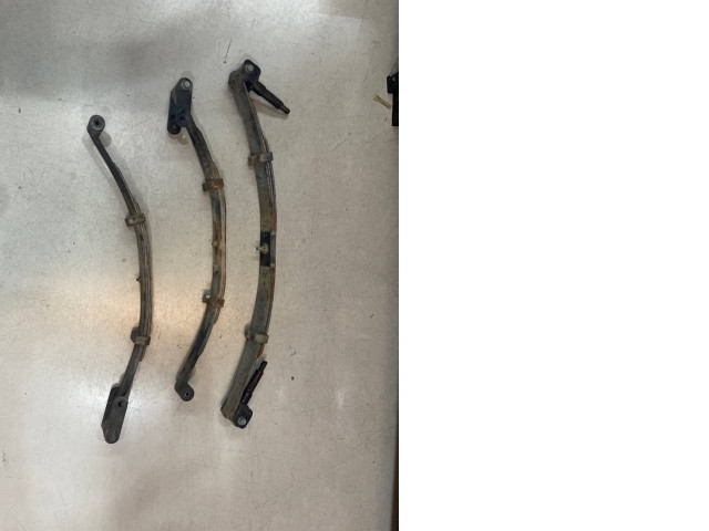 This image features a set of three used suspension mounts likely from an automotive vehicle. These pivotal components are designed to connect and stabilize parts of the vehicle's suspension system. Their robust and curved metal construction suggests durability and the capability to withstand substantial mechanical stress. Notable is the wear and tear visible on the items, indicating previous use and the need to ensure they are fit for further service before reinstallation. The mounts include pivoting joints and fixed mounting points for secure attachment. Despite the signs of use, these suspension mounts are integral for maintaining a vehicle's alignment and ride quality.