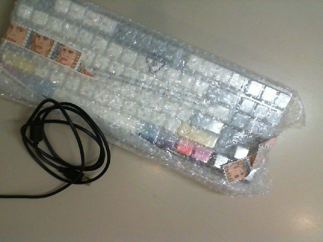 This is a wired keyboard that shows signs of previous use. The keyboard features a standard layout with various keys, which may be designed for both general and gaming purposes. It is likely made with a plastic casing that has a smooth texture. The keys may be slightly worn but are functional. The keyboard is accompanied by a black, flexible cable for connection to a computer, providing reliable performance without the need for batteries. Note that this is not a brand-new product, and minor imperfections may be present, but it remains a practical option for users looking for a cost-effective input device.