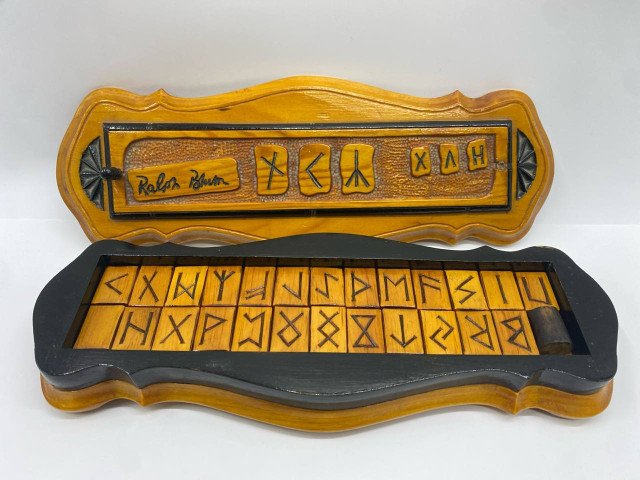 The Game Toys Runes set features intricately designed wooden runes that serve as both a playful and mystical gaming experience. Each rune is carved from durable wood, showcasing natural grains and a smooth finish. The set includes a beautifully crafted holder with elegant curves, adorned with contrasting black accents that enhance its aesthetic appeal. The runes are etched with ancient symbols, representing different meanings and powers, inviting players to explore the world of mythology and divination. Perfect for tabletop games, storytelling, or as a decorative item, this set combines functionality with artistry.