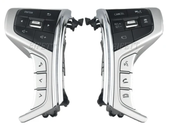 The Mitsubishi Pajero Sport steering wheel buttons set includes two high-quality control buttons designed specifically for the Pajero Sport model. Each button features an ergonomic design that facilitates ease of use while driving. The buttons have a sleek, modern appearance with a shiny chrome finish that enhances the aesthetic of the vehicle's interior. The set includes various controls such as audio adjustments and cruise control functions, allowing drivers to operate essential functions without taking their hands off the wheel. These buttons are made from durable materials to ensure longevity and resistance to wear and tear.
