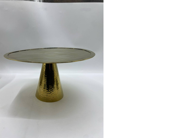 This elegant one-tier cake stand is crafted from high-quality copper and brass, showcasing a beautiful round shape. The stand features a stunning hammered texture that adds a touch of sophistication and charm, making it perfect for displaying cakes, pastries, or other desserts at celebrations and gatherings. Its shiny golden finish reflects light beautifully, enhancing the presentation of any treat placed upon it. The sturdy base ensures stability, while the elevated design allows for easy access to delicious delights from all angles. This cake stand is not only functional but also serves as a striking centerpiece in any kitchen or dining setting.