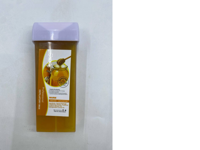 This product is a warm professional depilatory wax designed for effective hair removal. It features a smooth and sticky texture that adheres well to the hair while being gentle on the skin, ensuring minimal irritation. The wax is infused with natural ingredients like glycerin rosinate and coconut oil, which help to moisturize and protect the skin during the waxing process. Its amber color indicates its honey-like consistency, enhancing its appeal. The container is designed for easy handling, with a sturdy purple lid that keeps the wax secure. Ideal for both professional and home use, it provides a convenient solution for achieving smooth, hair-free skin.