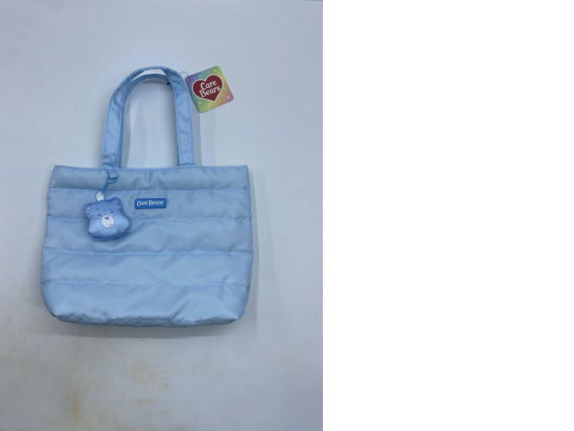This charming shoulder bag features a delightful design inspired by the beloved Care Bears. Made from soft, light blue fabric, it has a quilted texture that adds dimension and style. The bag is equipped with sturdy, comfortable handles for easy carrying. A cute Care Bears plush keychain hangs from the side, enhancing its playful appeal. The bag is perfect for everyday use, providing ample space for essentials like books, a tablet, or personal items, making it a delightful accessory for fans of all ages.