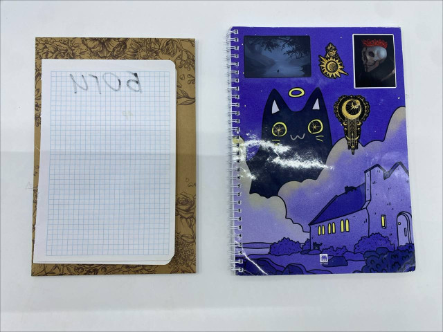 This notebook features a vibrant and artistic cover, adorned with a collection of colorful stickers ..