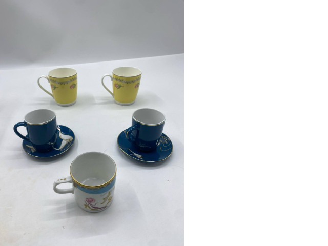 a set of 5 tea cups and saucers