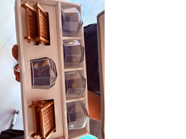 Juice set of 5 glass glasses and 4 wooden palettes