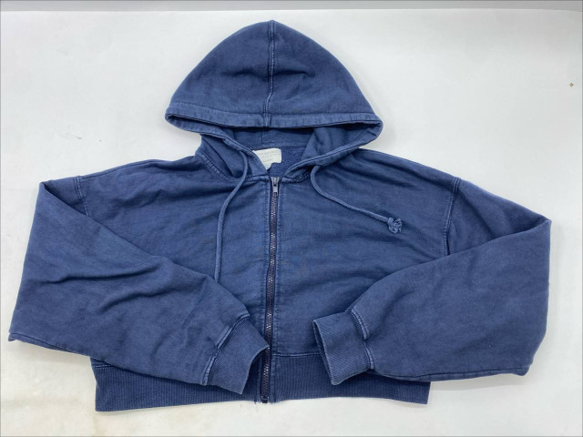 Women's blue long-sleeved hooded zip-up sweatshirt.
