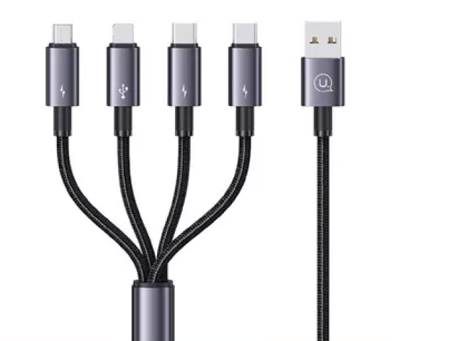 The 4 in 1 phone cable is a versatile and multifunctional charging solution designed to cater to various devices. It features four different connectors: USB-C, Micro USB, Lightning, and a standard USB-A port, allowing users to charge and sync multiple devices seamlessly. The cable is constructed with a durable braided exterior that provides enhanced resistance to wear and tear, ensuring longevity. With a convenient split design, the connectors are easily accessible for fast charging and data transfer. This 4 in 1 cable not only simplifies charging for users with diverse devices but also reduces clutter by offering one solution for all their charging needs.