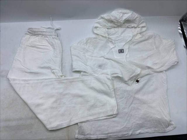 White trousers and a white long-sleeved hooded shirt.