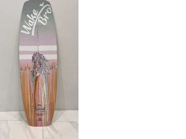 This is a pre-owned wakeboarding board featuring a striking graphic design of a colorful skull overl..