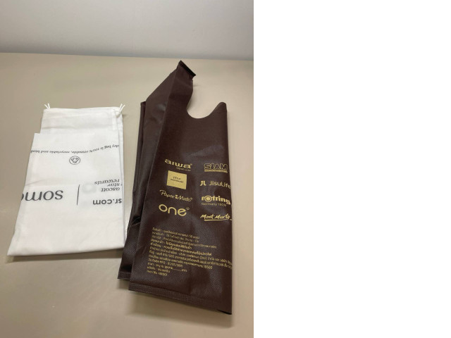 This set of two shopping bags offers versatility and convenience for all your shopping needs. The first bag is a sleek white fabric bag, designed with a minimalistic look, featuring subtle text prints that enhance its aesthetic appeal. It is lightweight, yet sturdy, making it perfect for carrying groceries or everyday essentials. The second bag is a stylish brown bag made from durable material, showcasing a unique design with gold accents and brand logos. This bag is not only fashionable but also functional, ideal for carrying a variety of items. Both bags are reusable, promoting an eco-friendly lifestyle while providing a reliable shopping solution.